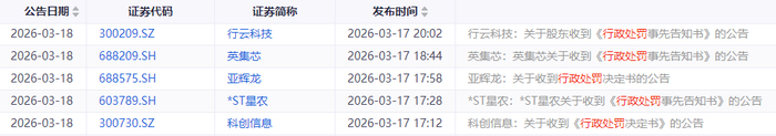 3月18日披露行政处罚决定书或事先告知书的公司,图源:同花顺iFind英集芯、亚辉龙:涉及“脑机接口”被罚