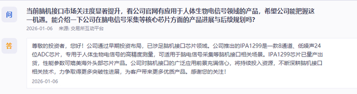 今年1月5日,英集芯以“自问自答”方式在互动平台发问:“公司在脑电信号采集等核心芯片方面的产品进展与后续规划如何?”次日该公司回复称,已涉足脑机接口芯片领域,推出的IPA1299芯片是一款8通道、低噪声24位ADC芯片,专用于人体生物电信号的高精度测量,可适用于脑电信号采集等脑机接口相关场景。目前已量产出货,性能参数媲美海外头部芯片产品。