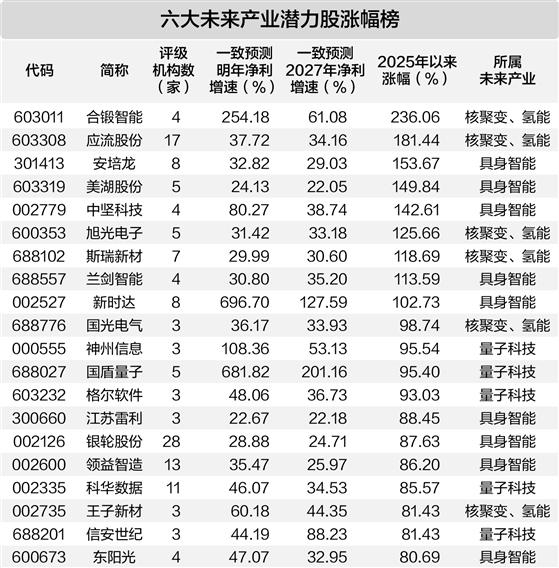 部分公司的成长性值得期待。据数据宝统计,3家及以上机构评级个股中,有59只个股一致预测明年及2027年净利增速均超20%。其中国盾量子、新时达两只个股未来两年机构一致预测净利增速均超100%,合锻智能、神州信息、华中数控等个股净利增速均超50%。