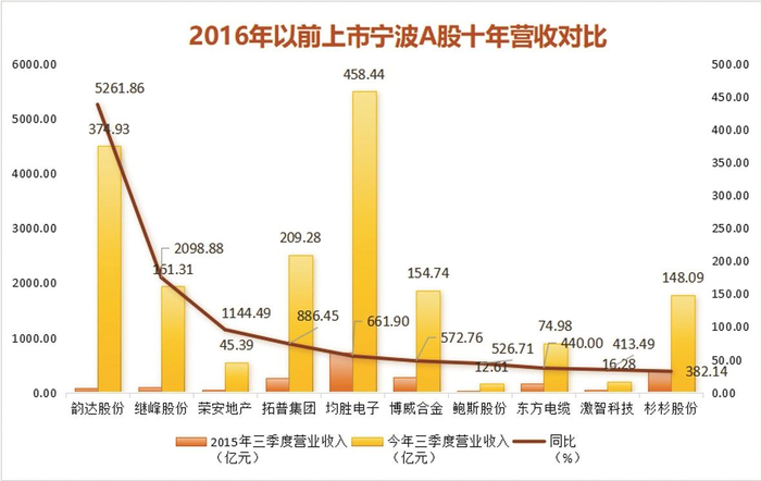 统计显示,在2015年底前上市的49家宁波企业中,营业收入十年翻倍的有33家,韵达股份、继峰股份、荣安地产等均增长超10倍;归母净利润10年倍增的有19家,东方电缆、韵达股份、博威合金等均增长超10倍。