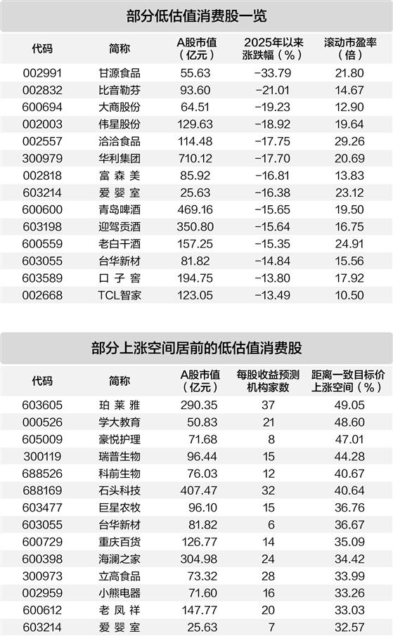 从当前的估值水平和股价表现来看,多只消费股已具备估值优势。本文以食品饮料、商贸零售、农林牧渔、美容护理、家用电器、纺织服饰及社会服务行业中与消费密切相关的股票为样本,从中筛选出滚动市盈率较低的潜力消费股。