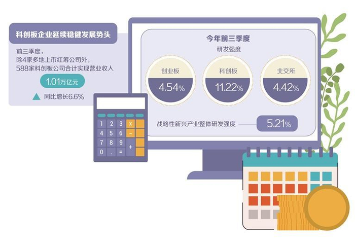 以科创板为例,科创板企业延续稳健发展势头,前三季度,除4家多地上市红筹公司外,588家科创板公司合计实现营业收入1.01万亿元,同比增长6.6%。