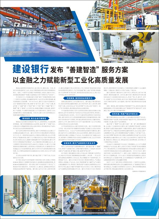 作为国有大行,中国建设银行(简称“建行”)积极贯彻落实党的二十届四中全会精神,将金融服务新型工业化列为长期经营战略,强化统筹谋划、系统部署。今年10月16日,建行正式发布支持新型工业化“善建智造”服务方案,围绕“向‘新’而行,建‘工’利业”主题,推进“建‘工’长融”“建‘工’科创”“建‘工’升级”“建‘工’链融”“建‘工’集群”“建‘工’跨境”六大专项行动,构建长期融资、科技创新、转型升级、产业链条、产业集群、跨境发展六大产品服务体系,为新型工业化高质量发展注入强劲金融动能。未来3年,建行力争为各类制造业主体提供融资规模超5万亿元。