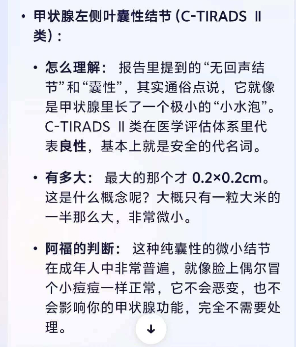 此外,阿福还会向用户具体解释各类专业信息的含义。举例来说,当我们测试一个常见的体检项——甲状腺结节,报告上写的是“C-TIRADS II 类”,普通人根本无法理解。阿福则解释说:这就像甲状腺里长了一个极小的“小水泡”,大概只有一粒大米的一半那么大。