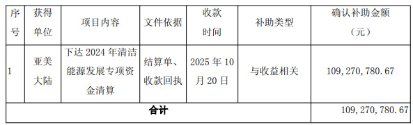 10月20日,子公司亚美大陆煤层气有限公司从合作方收到与收益相关的马必区块政府补助1.09亿元。此次从合作方收到的政府补助在扣除增值税(税率9%)后一次性计入当期损益。