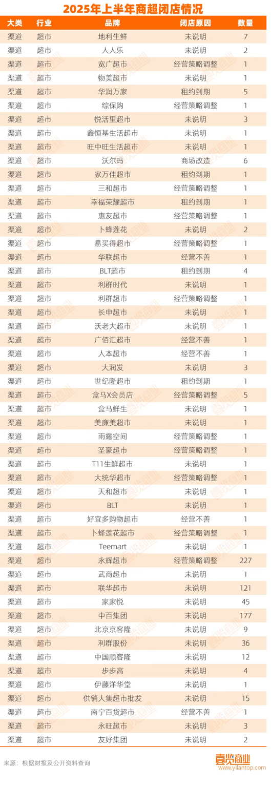 据壹览商业不完全统计,2025年上半年,全国至少有720家超市关门,其中卜蜂莲花、华润万家、永辉超市、大润发等为代表的大卖场模式倒闭之数占据过半。曾经作为中国内地大卖场的领头羊家乐福,中国大陆现仅剩3家门店。