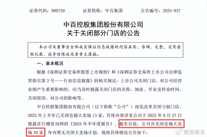 12月4日,中百集团发布公告称,为深化经营改革,已累计关闭仓储大卖场30家,其中2025年上半年关闭13家。在这30家门店中,高达23家因亏损而停业,占比76.7%,仅7家是因合同到期正常关闭,因此次闭店产生的一次性损失预计达1.8亿元。
