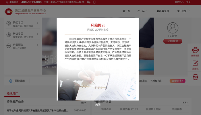 浙江金融资产交易中心官网滚动发布《风险提示》显示,浙江金融资产交易中心作为交易服务平台进行信息发布,不对任何投资人或/及任何交易提供任何担保,无论明示、默示或投资人自以为存在的。浙江金融资产交易中心不承担任何因产品交易产生的风险,或代替产品挂牌交易机构或/及增信人履约的责任。