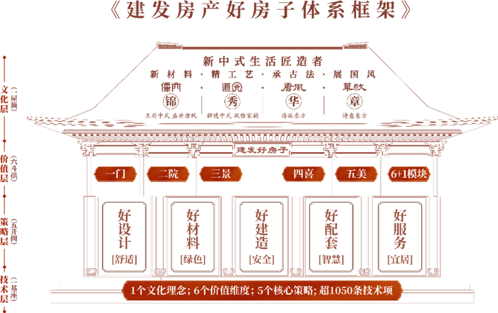 “灯塔战略”的成功,根植于建发房产对人居需求的深度洞察,以及其所构建的“文化-价值-策略-技术”四维一体的“好房子”体系框架。该体系从1个文化理念、6个价值维度、5大核心策略及超1050条技术项出发,匠心打造富有传统文化底蕴的高品质现代人居,并率先在“灯塔”项目中落地实践。