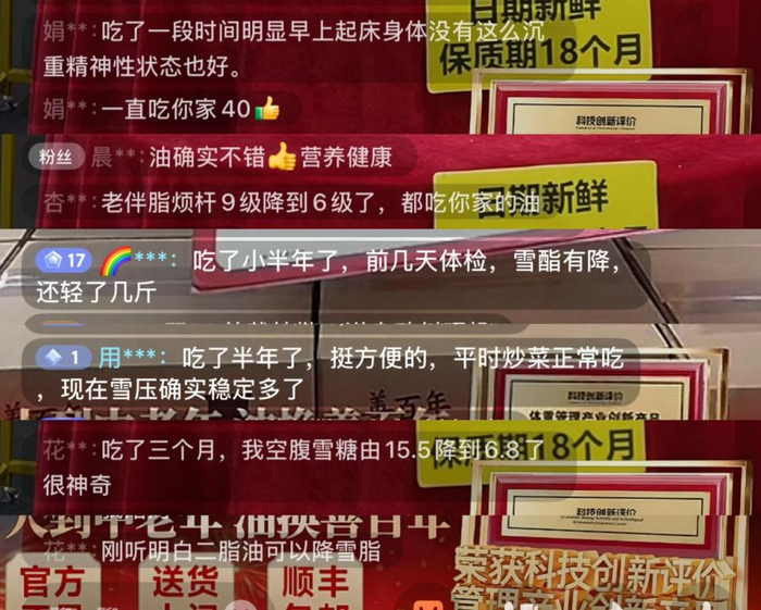 图源:甘油二酯先端研究院此外,《消费者报道》记者还在不同直播平台发现,善百年相关直播的评论区存在大量相似且重复出现的留言,如“油真的很好,吃过易消化,医生说有脂方(肪)肝,吃了半年明显有下降了”“我已经10年甘油三只膏(脂高),今年吃你家油降下来了,人也轻松很多!”等。