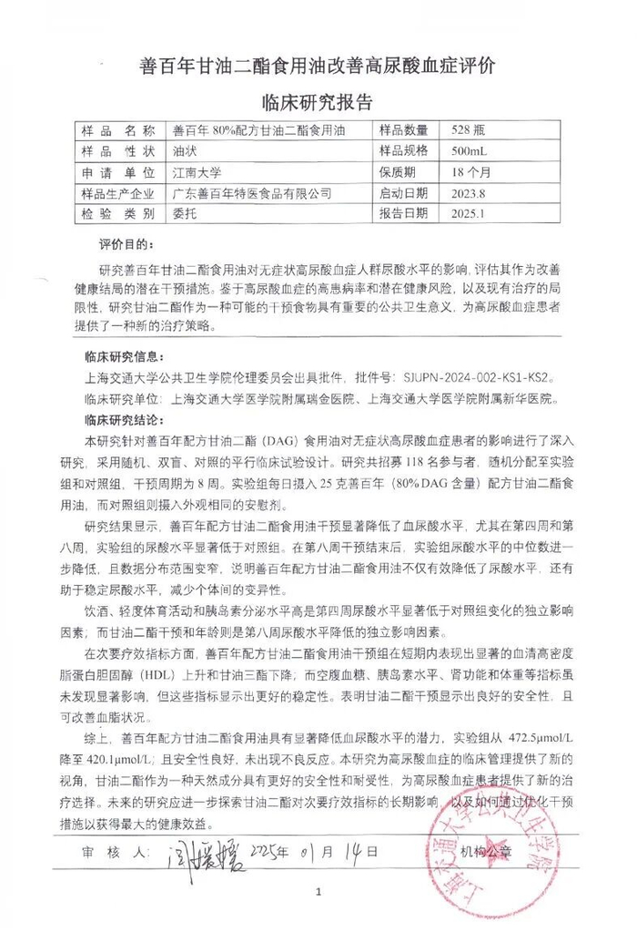 图源:善百年食用油旗舰店直播间然而,《消费者报道》记者翻阅公开资料发现,主播所提及的“真人实测”系善百年甘油二酯食用油降尿酸随机对照临床实验。研究表明,善百年配方甘油二酯食用油具有显著降低血尿酸水平的潜力,实验组从 472.5μmol/L降至 420.1μmol/L,且安全性良好。而在次要疗效指标方面,善百年配方甘油二酯食用油干预组在短期内表现出显著的血清高密度脂蛋白胆固醇(HDL)上升和甘油三酯下降;而空腹血糖、胰岛素水平、肾功能和体重等指标并未发现显著影响。
