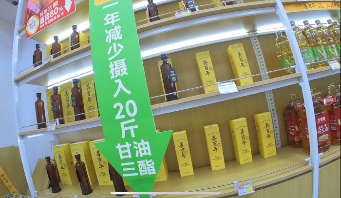 善百年某线下门店 《消费者报道》记者 摄不仅是实体门店,善百年官方账号在直播过程中同样存在宣传产品功效的行为,不断向观众表示该食用油可“降低体内甘油三酯含量”,还提及能够预防“脂某肪(注:直播间规避敏感词的话术)”的专利技术。