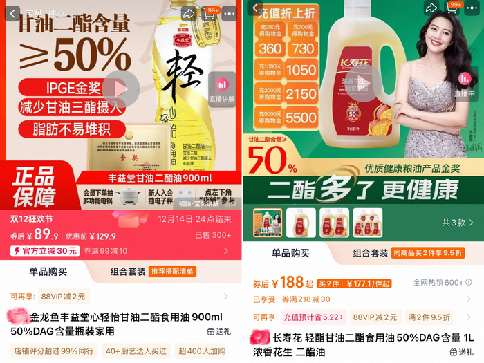 图源:电商平台即便在甘油二酯食用油这一细分品类中,善百年的定价也明显高于同类品牌。例如,金龙鱼丰益堂心轻怡甘油二酯食用油900毫升(50%甘油二酯含量)的券后价为89.9元,折合每100毫升约10元;长寿花轻酯甘油二酯食用油(50%甘油二酯含量)1升的券后价为188元,折合每100毫升约18.8元。而善百年50%含量产品(500毫升 294.6元)每100毫升约58.9元,约为金龙鱼同款的5.9倍、长寿花同款的3.1倍。