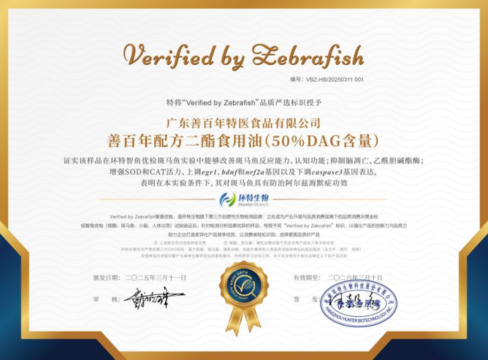 图源:甘油二酯先端研究院但记者仔细查阅该证书发现,证书中一栏小字标明:“细胞、斑马鱼、哺乳动物试验不完全对等产品在人体中的功效”。为何善百年仍大肆宣传其配方二酯油能帮助健康人群提前预防阿尔茨海默症,延缓阿尔茨海默症从轻度向重度发展的进程。善百年是否已开展对人体的相关临床试验?若仅以斑马鱼试验结果为依据,该数据是否足以支撑“善百年配方二酯油能帮助健康人群提前预防阿尔茨海默症”的宣传结论?