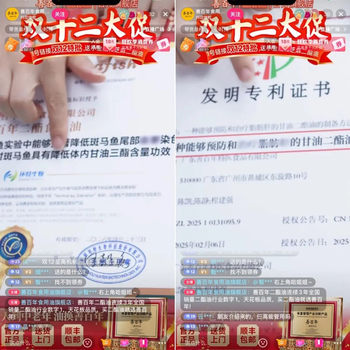 在讲解该技术时,主播手持“发明专利证书”向观众展示,证书中一行文字被红色框标注,部分关键字样被模糊处理,内容显示为“一种能够预防和XX脂肪X的甘油二酯……”。但记者仔细观察该发明专利证书发现,红色框标注文字上方清晰写着“一种能够预防和治疗脂肪肝的甘油二酯油的制备方法”。