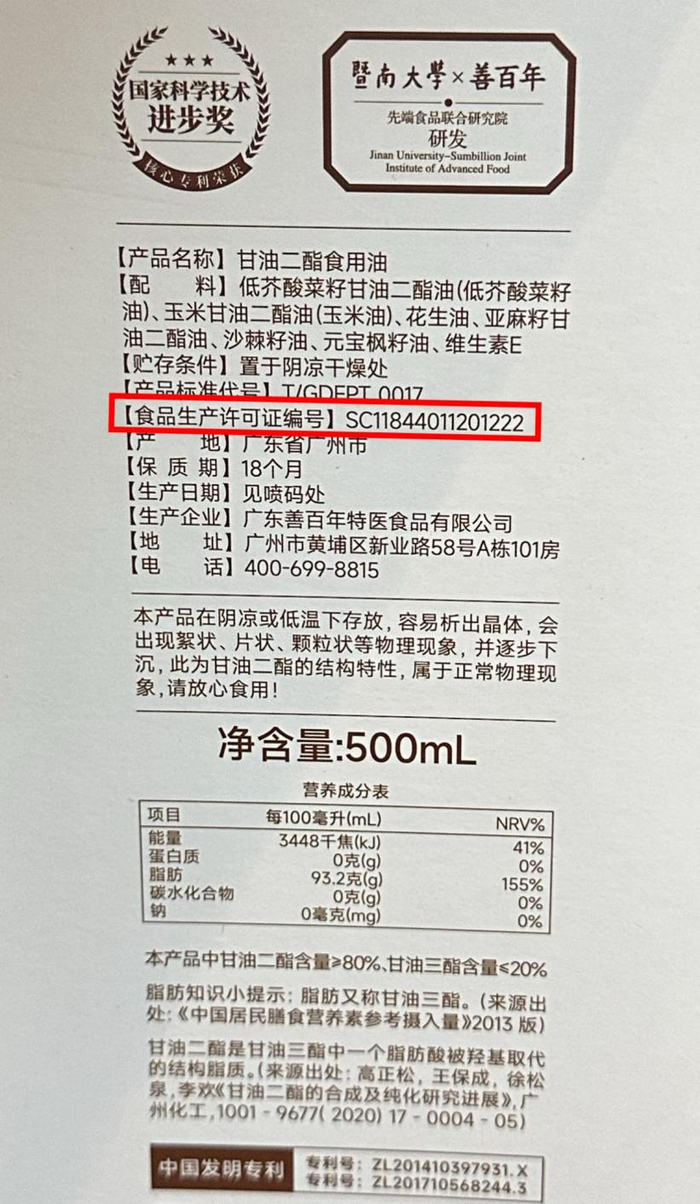 《消费者报道》记者调查发现,这款宣称“多项专利加持”的高价油,商品包装上的批准文号只有“SC”食品生产许可证编号,本质为普通食品。根据我国法律法规规定,普通食品不得宣称保健功能,不得涉及疾病预防治疗功能。