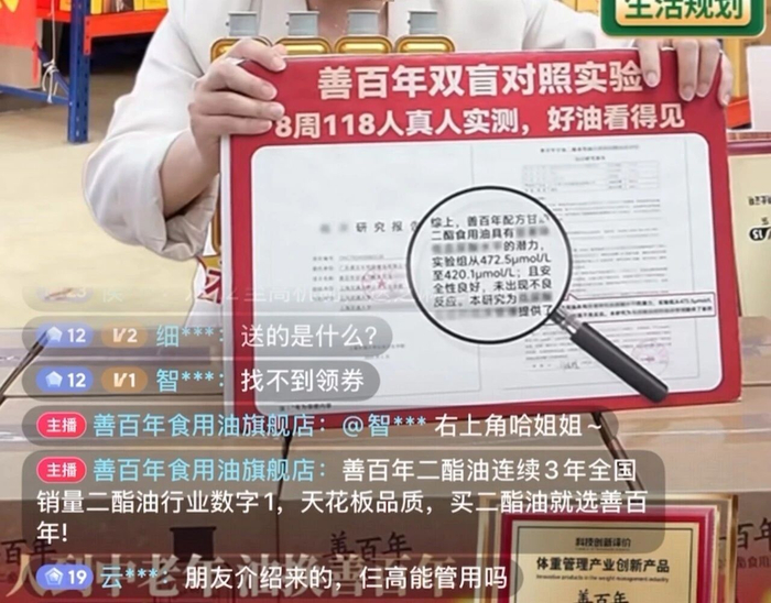 图源:善百年食用油旗舰店直播间随后,主播着重强调产品功效有“真人实测”支撑,并展示有“善百年双盲对照实验,8周118人真人实测”字样的牌子,称“只要8周,数值上显著地改变了。这款油三重功效、三重验证、三重保证。”
