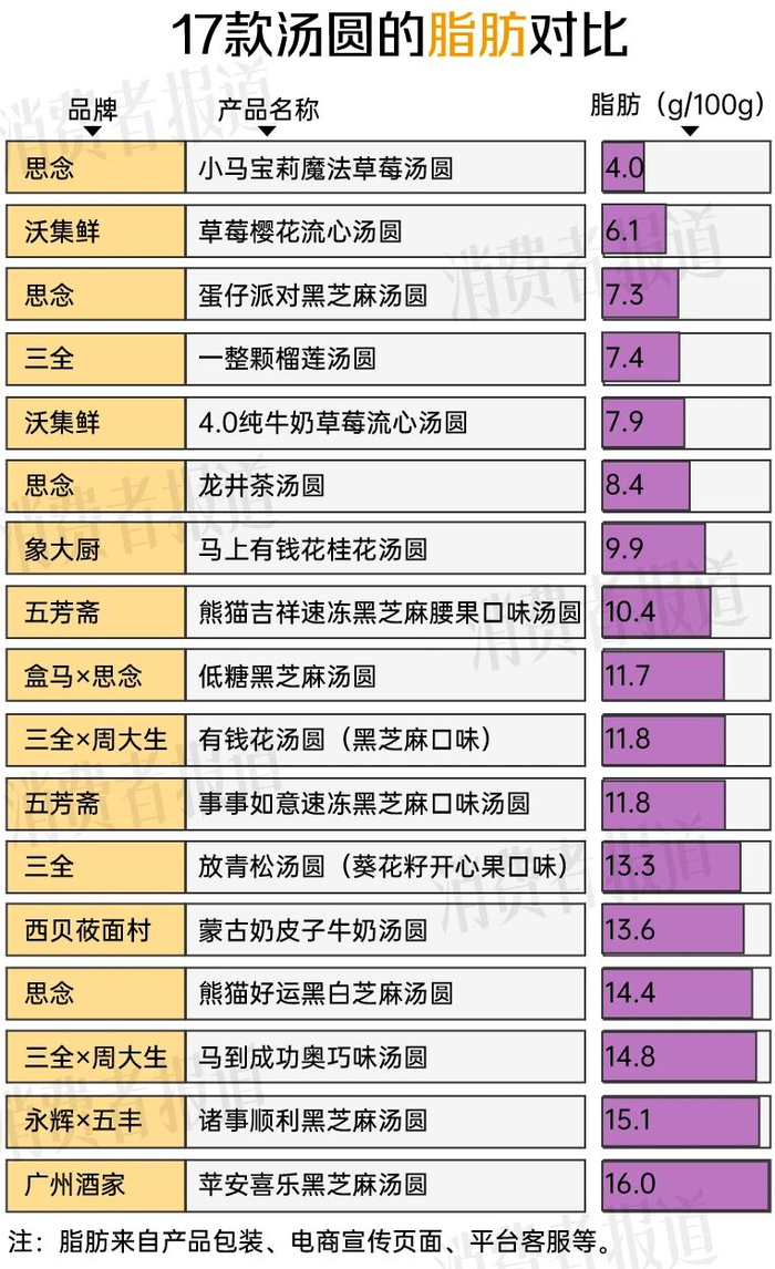 最高脂的广州酒家“苹安喜乐”黑芝麻汤圆与最低脂的思念“小马宝莉”魔法草莓汤圆相差了4倍,前者与薯条的脂肪含量相当,后者和平时吃的鲜奶馒头或白吐司差不多。