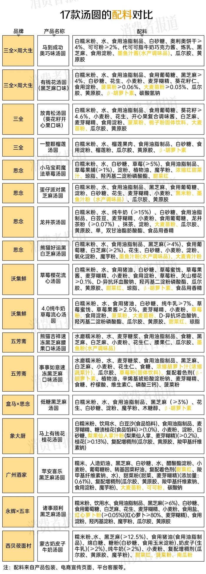 《消费者报道》发现,17款汤圆使用频率较高的着色成分多为天然色素,如β-胡萝卜素、甜菜红、大麦苗粉、墨鱼汁粉、菠菜粉等。
