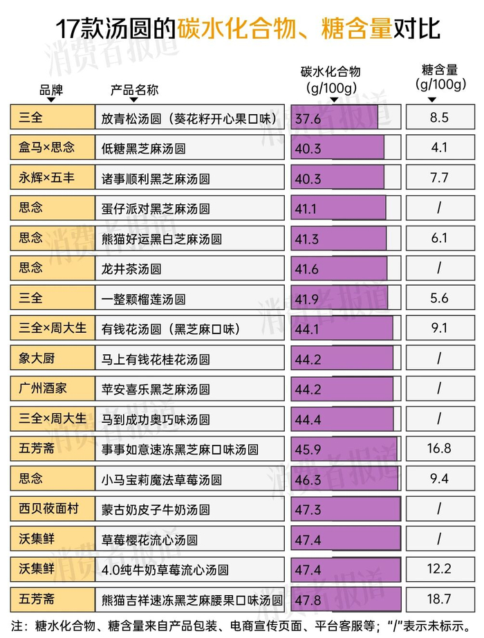 碳水化合物方面,17款汤圆的碳水化合物范围在37.6-47.8克/100克之间,差异并不明显。此外,由于糖含量并非预包装汤圆强制标示项,17款汤圆中仅有约半数产品有标注,含量为4.1-18.7克/100克。其中,仅盒马×思念的低糖黑芝麻汤圆达到低糖标准(≤5.0克/100克)。配方显示,该款产品使用了木糖醇替代部分甜味。