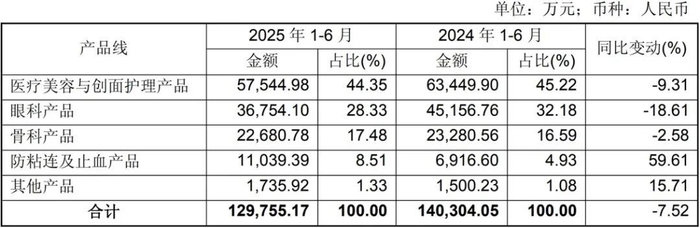 昊海生科2025年上半年各产品线收入及同比情况