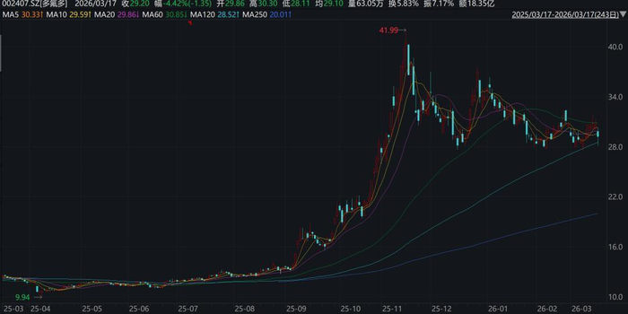 从市场反馈来看,尽管公司在开盘前发布了声明,但当日开盘,多氟多股价低开,盘中最低触及30.01元/股,随后有所拉升,至收盘报30.55元/股,微跌0.97%。截至3月17日午时,多氟多收于29.2元/股,股价下跌4.42%。