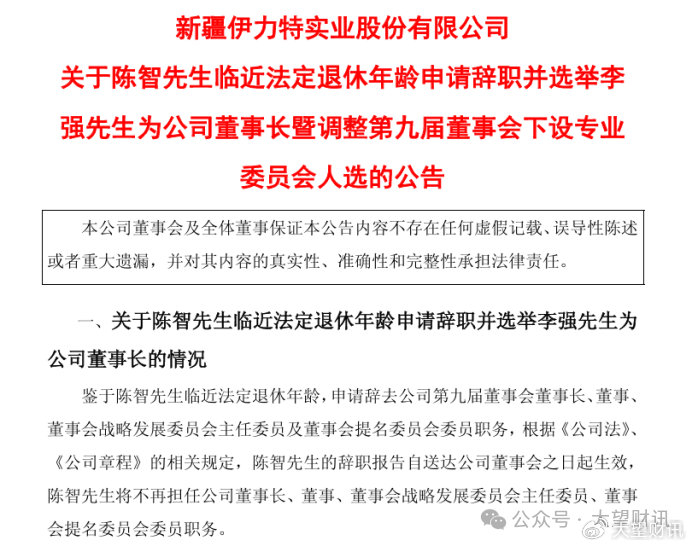 12月15日,伊力特发布公告称,鉴于陈智临近法定退休年龄,申请辞去公司第九届董事会董事长、董事、董事会战略发展委员会主任委员及董事会提名委员会委员职务。