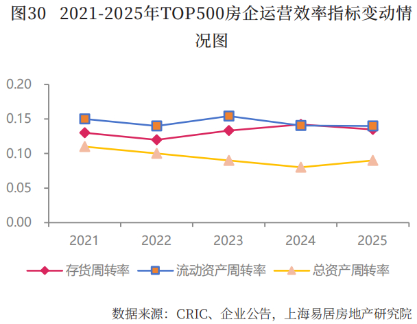 2025年TOP500房地产开发企业存货周转率均值为0.13,较上年下降0.01;流动资产周转率均值为0.14,与上年持平;总资产周转率均值为0.09,较上年上升0.01。2025年房企库存并没有增长,但房地产市场需求偏弱,房企存货周转率有小幅下降。受行业政策调整及房企资产结构优化双重推动,房企总资产周转率有所回升。
