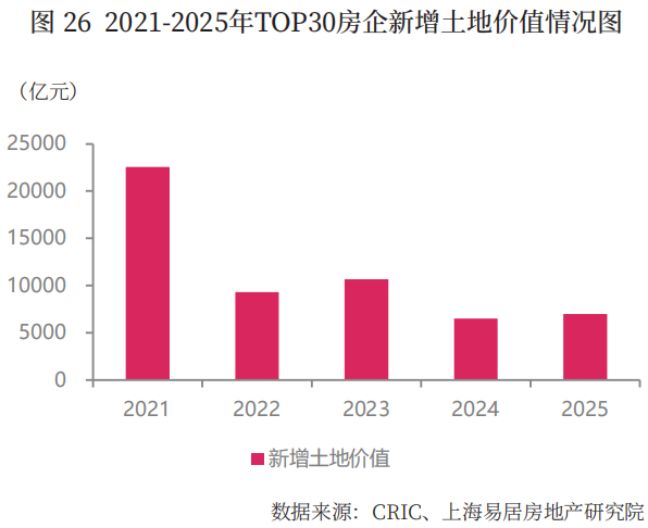 在投资方面,2025年多地推出土地市场利好政策,供地质量不断提升,提升了房企的拿地积极性。同时,近年来房企拿地力度减弱,随着存量土地的开发消耗,部分房企补仓意愿逐步增强。根据报告,2025年TOP30房企新增土地价值7012亿元,同比上升7.85%,头部房企拿地金额较上年有所回升。从拿地企业类型来看,央国企仍然是主力,拿地规模保持领先,民营房企投资信心呈现复苏态势。