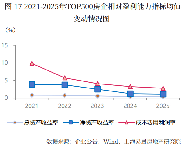 2025年房地产行业总资产规模继续负增长,同时企业利润空间收窄,TOP500房企总资产收益率继续下降。报告显示,2025年TOP500房地产开发企业总资产收益率均值为0.38%,较上年下降了0.03个百分点;净资产收益率均值为1.10%,较上年下降了0.12个百分点;成本费用利润率均值为2.77%,较上年下降了0.48个百分点。