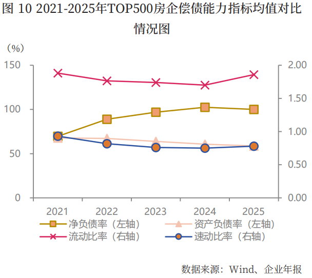 从长期偿债能力看,TOP500房企2025年资产负债率均值为58.65%,较上年下降2.07个百分点;净负债率均值为99.98%,较上年下降2.52个百分点。短期偿债能力方面,TOP500房企流动比率均值为1.86,较上年上升0.16;速动比率均值为0.78,较上年上升0.03,二者较上年均有小幅增长。尽管房企短期偿债能力有所改善,但仍有超过七成的企业速动比率小于1,可变现的流动资产无法覆盖流动债务,短期偿债压力较大。