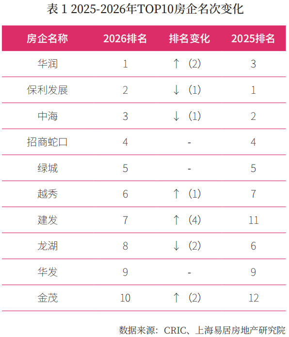 研究报告显示,2026房地产开发企业综合实力TOP500前三位由华润置地、保利发展和中海占据。其中,华润置地名次上升至第一位,保利发展、中海分别下降至第二位和第三位,招商蛇口、绿城、越秀、建发、龙湖、华发、金茂分列第四至第十位。