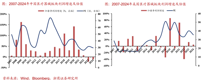 同时对比中美医疗器械板块利润增速及估值发现,我国医疗器械企业正处于创新加速期以及海外拓展加速期,有望带来收入成长拉动,后续随着2025年上半年及后续利润增长持续恢复,板块估值有望重回40倍PE左右区间。