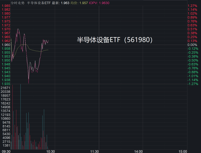 上游半导体设备领域由于需求受益,相关个股亦表现亮眼。半导体设备ETF(561980)目前涨0.15%,成份股神工股份涨超10%再刷新高,有研硅涨超5%,雅克科技、中船特气、至纯科技、安集科技等设备、材料股纷纷涨超3%。