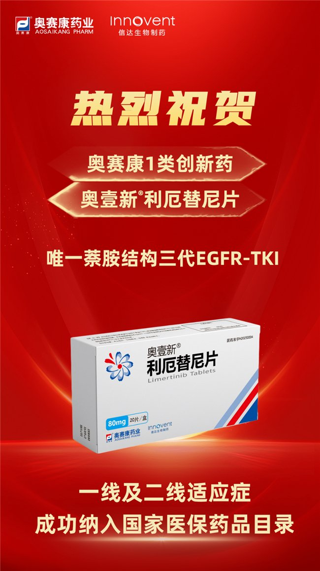 此次调整中,奥赛康药业(股票代码:002755)自主研发生产的1类创新药奥壹新®(通用名:利厄替尼片)成功通过谈判,被正式纳入国家医保目录,有望减轻显著减轻患者经济负担,提升临床可及性。