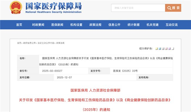 12月7日,国家医保局发布《国家基本医疗保险、生育保险和工伤保险药品目录》以及《商业健康保险创新药品目录》(2025年)。据统计,本次医保目录调整共有114种药品新增进入、29种药调出另有18家企业的19种药品进入商保创新药目录,并决定于2026年1月1日起正式执行,这也是医保目录调整中首次同步推出商保创新药目录,形成基本医保与商业健康保险协同保障创新药的双轨格局。