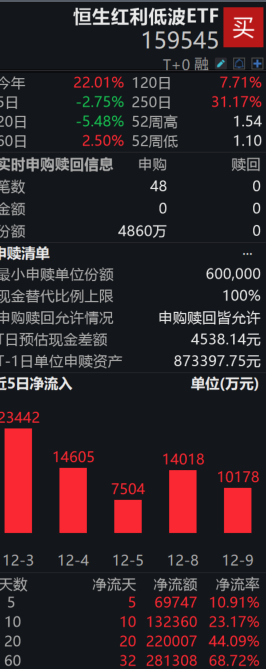 恒生红利低波ETF(159545)紧密跟踪恒生港股通高股息低波动指数,该基金备受资金关注,近5日资金净流入超6.9亿,近10日资金净流入超13亿;截至发稿,该基金盘中资金净申购4860万份;该基金最新规模达68.94亿元,再创历史新高。
