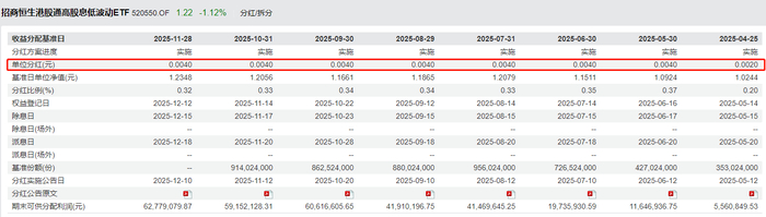 细心的朋友其实也会发现,这只ETF每次分红都与招商旗下另一只港股红利低波ETF(SH:520550)保持同步。而这两只品种也是我们经常提到的,适合作为AH跨市场红利哑铃策略,构建一个市场分散、风格分散的低费率长期“按月领工资”底仓。