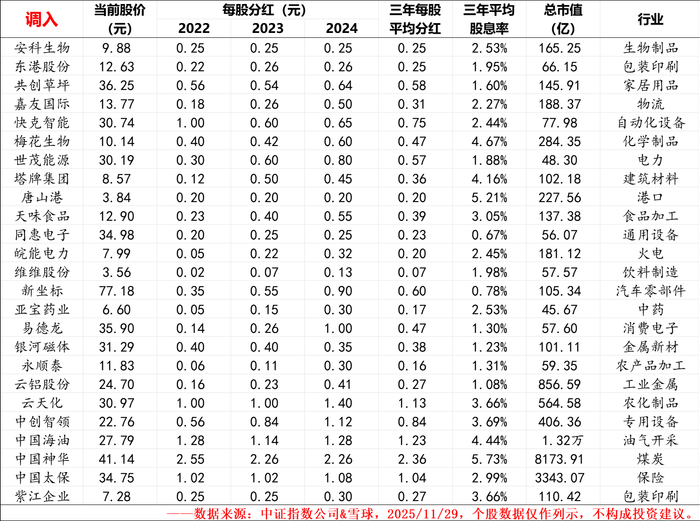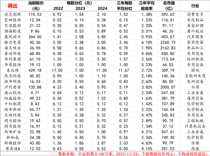 3、对有送转行为股票的每股分红做了前复权处理,2024年年度每股分红数据未计算2025年中期分红。