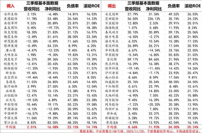 从2025年三季报数据看,调入样本的净利增速是(16.08% VS -11.93%)、负债率(23.15% VS 34.00%)要好于调出样本,营收增速是(2.01% VS 8.66%)、ROE(14.74% VS 20.24%)要弱于调出样本,意味着指数从“追求规模与历史盈利”向“追求盈利增长与财务健康”的改变。