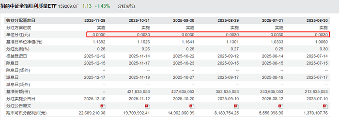 有意投资中证红利质量指数的朋友可以关注中证红利质量ETF(SZ:5159209),这也是全市场唯一一只跟踪中证红利质量指数的产品,0.15%管理费+0.05%托管费的最低费率组合&月度评估分红的搭配诚意满满,收息党不容错过~而就在今日,本月的分红公告发布,每份按惯例,稳定分红0.003元,预估全年分红比例3%以上,接近当前指数股息率的4%。