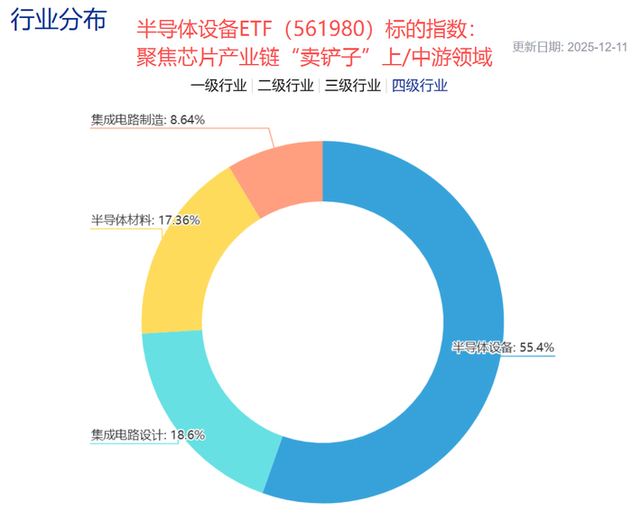 中证指数官网数据显示,半导体设备ETF(561980)跟踪中证半导,标的指数中半导体设备+材料+集成电路设计三行业占比超9成,均为国产替代的关键领域。从重仓股来看,指数重点布局中微公司、北方华创、寒武纪、中芯国际、海光信息等产业龙头,指数年内涨幅为55.56%、区间最大上涨超80%,在中华半导体芯片、国证芯片、芯片产业等主流半导体指数中位列第一,弹性突出。
