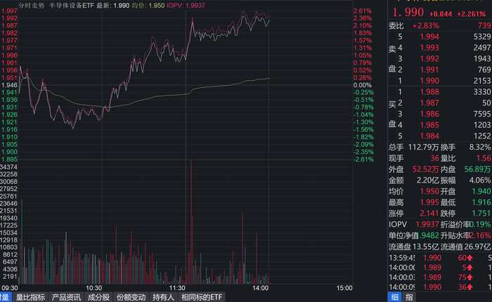 资本市场迅速响应。午后A股半导体设备产业链显著走强,呈现探底回升态势。截至14:00,半导体设备ETF(561980)上涨2.26%,实时成交额突破2.2亿元。