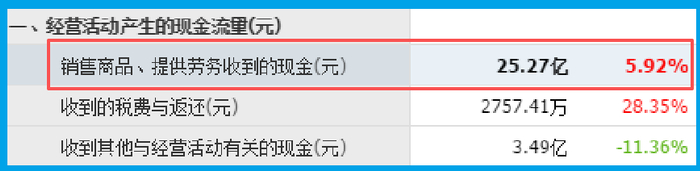 第一项关键物证是现金流:销售商品收到的现金总额为25.27亿元,同比增长5.92%,且高于营业收入。