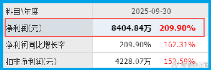 康达新材2025年第三季度财报,第一个数字就极具冲击力:归母净利润8404.84万元,同比增长率高达惊人的209.90%。
