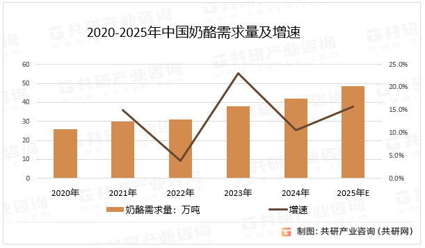 图片说明:2020-2025年中国奶酪需求量及增速,数据来源于共研产业咨询