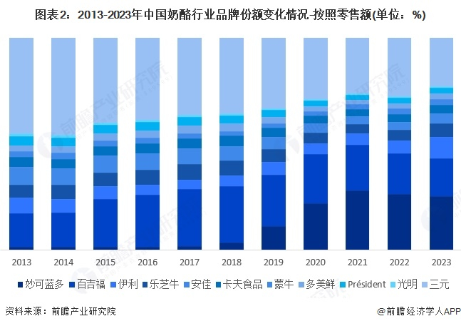 图片说明:2013-2023年中国奶酪行业品牌份额变化,数据来源于前瞻产业研究院(注:2024年数据暂未披露)