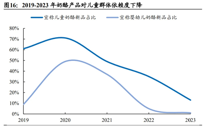 图片说明:2019-2023年奶酪产品对儿童群体依赖度下降,数据来源于MINTEL、国泰海通证券