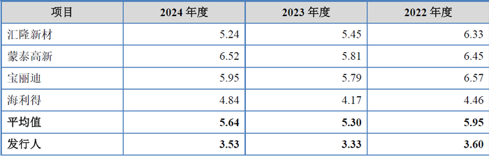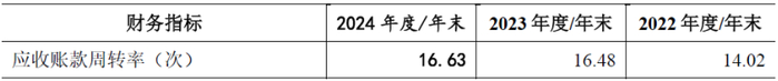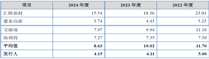 从上表可见,发行人应收账款周转率分别为5.00、4.11、4.15,几乎为可比公司中的最低值,仅在2024年度略优于蒙泰高新,而蒙泰高新本身2024年度归母净利润为-6,454.60万元,为可比公司中唯一家不盈利企业。总体而言发行人应收账款周转率水平仅为可比公司平均值11.70、10.02、8.63的一半左右。