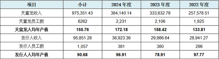 依据发行人与天富龙招股书中披露的的营业收入数据及员工人数,我们可以计算出二者人均年产值的比较情况,如下表所示: